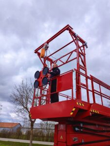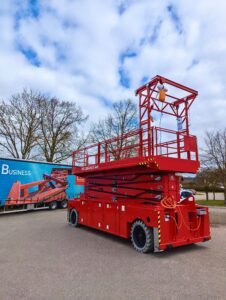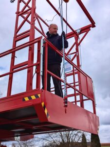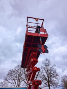 Um den spezifischen Anforderungen der Kettler Kirchner GbR gerecht zu werden, wurde die Scherenhubarbeitsbühne um einen speziellen Kranaufbau mit elektrischem Kettenzug erweitert.